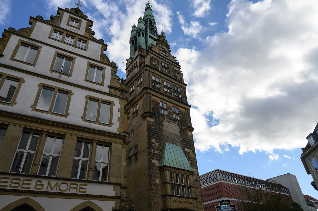 Unser Navi führte uns vom Stellplatz Greven nördlich auf die Landstraße B475. Auf der sind wir bis Bad Rothenfelde geblieben. Auf der ging es dann Richtung Osten bis zur A33. Auf der ging es dann süd-östlich in Richtung Bielefeld. Bei Steinhagen haben wir die A33 dann wieder verlassen und nun ging es nur noch auf Landstraße bis zum Stellplatz in Bielefeld. Unsere Befürchtung, dass es bei 10 Stellflächen nichts mehr frei sein könnte, war umsonst. Von den 10 Plätzen waren nur vier Plätze belegt. Also konnten wir uns wieder einen Platz aussuchen. Die Plätze sind gut und professionell gestaltet. Man steht auf Pflaster und hat aber zwischen den Bereichen einen breiten Rasenstreifen. Unser Womo war schnell benutzbar und wie immer haben wir in aller Ruhe einen Zwischenkaffee getrunken. Nach dem Kaffee habe ich mich alleine auf den Weg gemacht um einen Bäcker zu finden. Susanne hat heute wieder Schontag für ihren Fuß. Ich bin über den sogenannten Johannisberg gelaufen. Von dem gilt es gute 100 Meter Höhenunterschied bis zur Altstadt zu überwinden. Auf dem Hinweg leichter als auf dem Rückweg. Die Altstadt fand ich recht sehenswert und nun freue ich mich schon darauf morgen mit Susanne sie zu erleben. Einen Bäcker habe ich unterwegs gefunden, der ist aber etwas weiter als den zum Stellplatz ausgewiesenen Bäcker. Den werde ich dann morgen mit meinem Handy finden.