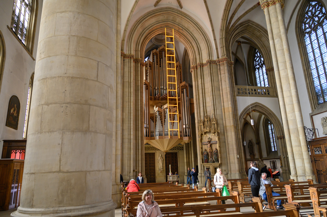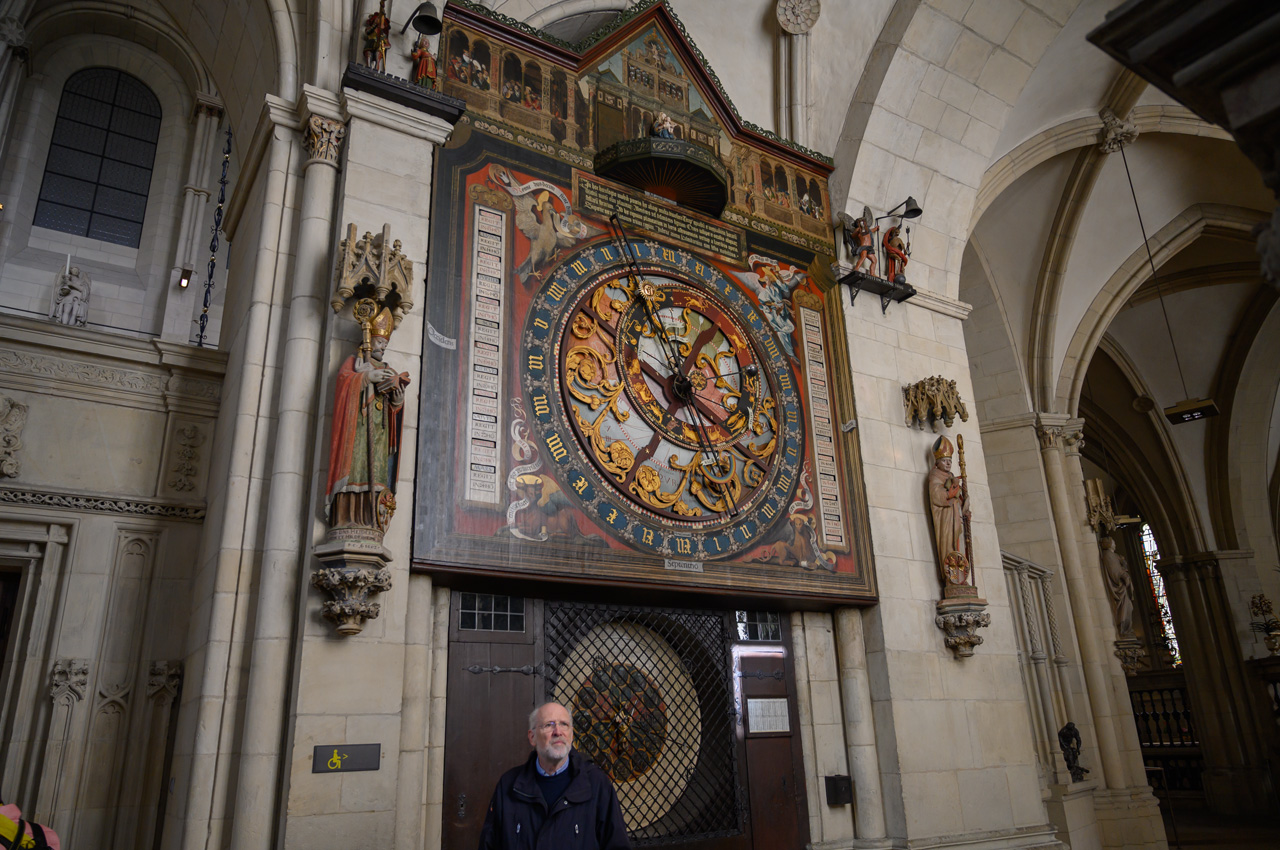 Gegen 12:00 Uhr sah es dann auch tatsächlich danach aus. Ich habe den NIU aus der Garage geholt und wir sind in Richtung Altstadt von Münster gestartet. Die angedrohten 13km haben wir problemlos geschafft, als Ziel hatte ich die Touristeninfo eingegeben. Den NIU haben wir in der Asche abgestellt, von da beginnt auch die Fußgängerzone. Auf dem Weg zur Touristeninfo waren wir noch in der Franziskanerkirche. Sie wird nicht mehr sakral genutz. In der Mitte des ehemaligen Kirchenschiffes gibt es ein Kunstwerk. Ein äußerst rühriger Aufseher hat uns erklärt, um was es sich hier eigentlich handelt. Aus der mitte der Kuppel hängt ein Pendel heraus mit einer Stahlkugel, die durch einjen pulsierenden Ringtrafo angetrieben wird. Auf einem Ring auf dem Boden sind Gradzahlen eingegeben. Anhand der Lageveränderung der Kugel beim Pendel, kann man die Erddrehung nachweisen. Die Kugel wandert mit ihren Ausschlägen auf dem Gradring, je nach Uhrzeit. Äußerst interessant und gut, dass uns das erklärt wurde, wir hätten sonst nicht verstanden, was das zu bedeuten hat. In der Touristeninfo haben wir uns mit einem Stadtplan ausgestattet, so haben wir auch schnell das historische Rathaus gefunden, ein sehr erstaunliches Gebäude oder besser gesagt Gebäudekomplex. Der Rathausturm steht komplett separat. Über den Prinzipalmarkt ist man an der St. Lamberti Kirche. Die Kirche enthält viele Epitaphe der Honorigen dieser Stadt. Wir haben erst durch die Ausgestaltung gemerkt, dass wir nicht im Dom sind, wovon wir beim betreten von ausgegangen sind. Von hier aus ging es zum Domplatz, wo gerade Wochenmarkt war. Hier tobte das Leben und man war förmlich gezwungen, im Mainstream mitzuschwimmen. Der Dom hat uns sehr beeindruckt, dieses Mal war es auch wirklich der Dom, besonders die astronomische Uhr, ein kleines technisches Wunderwerk. Nach der Dombesichtigung waren wir nochmal auf dem Wochenmarkt. Da war ein Stand aus den Niederlanden mit Poffertjes. Da konnten wir natürlich nicht widerstehen. Vom Domplatz aus sind wir noch zu der Liebfrauen-Überwasserkirche gelaufen. Die Kirche ist eher schlicht. Wir haben uns nicht lange darin aufgehalten, da wurde gerade eine Hochzeit vorbereitet. Von der Kirche aus sind wir im Bogen durch die schönen Fußgängerzonen zurück zu unserem NIU gelaufen. Das war ein ganz schön strammes Pensum für Susanne. Mit dem NIU sind wir noch zum Schloss gefahren. Vor dem Schloss war ein riesiger Rummel und für den Parkplatz sollte man 10,-€ für die Nutzung zahlen. Ist wohl ein bisschen heftig. Wir haben unseren NIU in einer Seitenstraße abgestellt und sind zum Schloss gelaufen. Schon wieder Laufen für Susanne, sie hat aber tapfer durchgehalten. Das Schloss ist in einem superguten Zustand und sieht sehr majestätisch aus. Für den dahinterliegenden botanischen Garten war es dann aber doch etwas viel für Susannes Fuß. Den heben wir uns für einen späteren Besuch mal auf. Auf dem Rückweg zum Womo haben wir an einem ALDI noch einen Zwischenstop eingelegt um uns mit frischen Lebensmitteln zu versorgen.