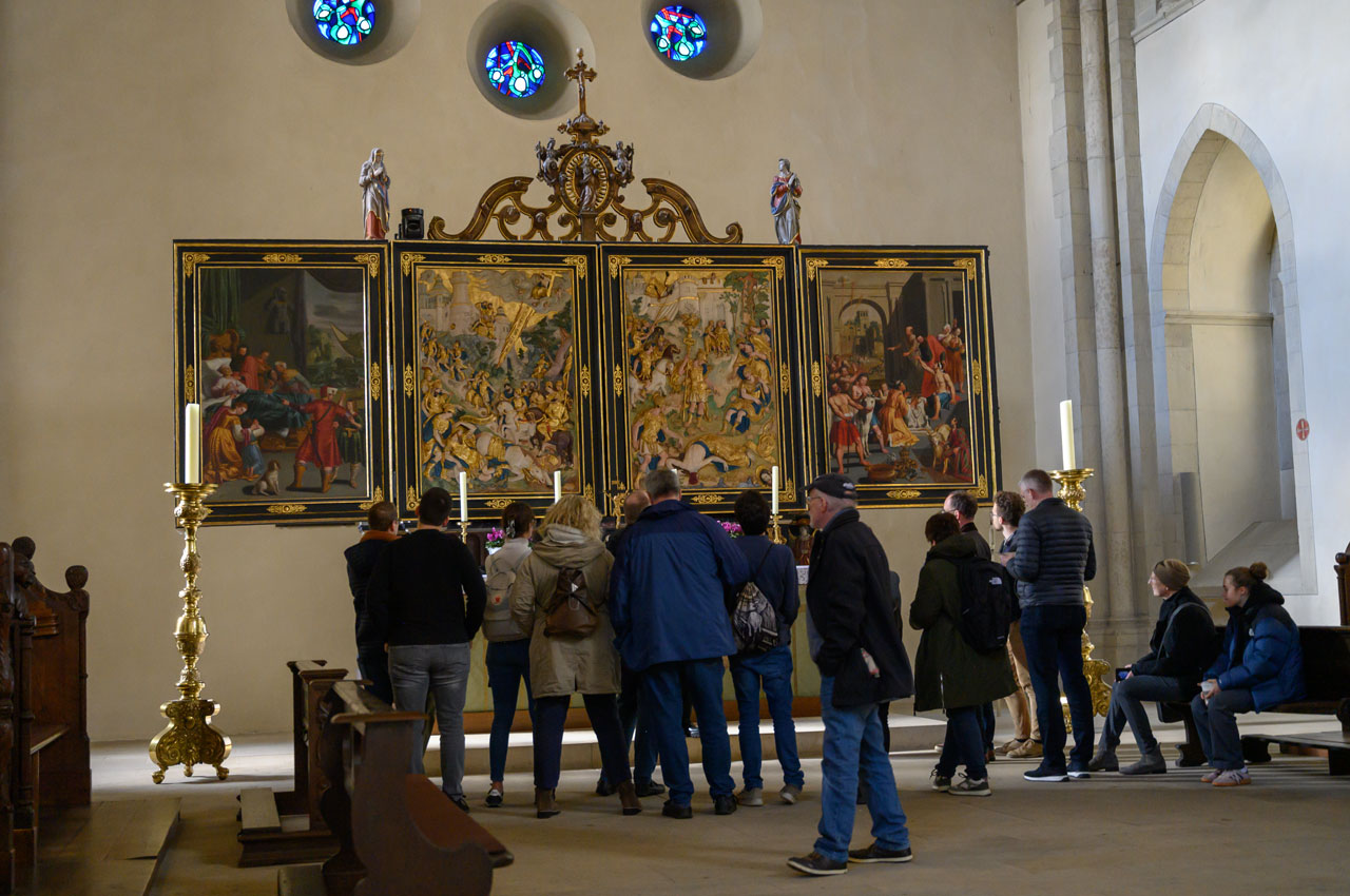 Die knackigen Brötchen haben es aber belohnt. Nach dem Frühstück löste sich der Nebel relativ schnell auf und es kam zeitweise sogar die Sonne durch. Gegen 12:00 Uhr sind wir auf den NIU gestiegen und in die Altstadt gefahren. Als Ziel hatte ich die Touristeninfo eingegeben. Sie ist im neuen Rathausgebäude, wobei das alte, historische Rathaus gleich nebenan ist. Von hier aus sind wir vorbei an der Altstädter Nicolaikirche auf den Alten Markt. Dort haben wir längere Zeit auf einer Bank mit Vivien-Sara telefoniert, aber auch den Anblick der schönen historischen Bürgerhäuser genossen. Wie wir später feststellen mussten, ist es auch der schönste Bereich von Bielefeld. In dem Rest der Innenstadt hat auch hier der zweite Weltkrieg furchtbare Spuren hinterlassen. Die meisten Gebäude sind Nachkriegsbauten mit der für diese Zeit typischen, minimalistischen Architektur, praktisch, quadratisch, gut. Mit Hilfe unserer Handys haben wir einen Weg zu einem Deichmannladen gefunden. Susanne brauchte neue Schuhe, die ihren ramponierten Fuß besser stützen und ihr das Laufen etwas schmerzfreier machen. Sie hat was passendes gefunden und das war auch im Rahmen ihrer Preisvorstellung. Die neuen Schuhe hat sie gleich anbehalten und die alten konnten wir in einem Müllkasten entsorgen. Sie meinte, es läuft sich damit gleich besser. Wir sind von dem Einkaufszentrum aus wieder zurück zur Altstadt und da haben wir uns noch die Jodokuskirche vom ehemaligen Kloster angesehen. Leider ist dort der Chor gesperrt und mit Folien zugehangen, weil dort Restaurierungsarbeiten durchgeführt werden. Die Kirche war baulich sehr interessant, weil sie noch den kompletten Kreuzgang hat und eine sehr sehenswerte Orgel. Von hier aus sind wir wieder vorbei an der Altstädter Nicolaikirche zurück zum Rathauskomplex gelaufen, wo unser NIU schon auf uns wartete. Er hat uns dann auf den Sparrenberg hoch gebracht, wobei ihm auf den letzten Metern fast die Puste ausging. Das sind verrückte Straßen, mit Steigungen von bis zu 20%. Dafür ist der zarte Stadtroller nicht gebaut. Auf dem Sparrenberg steht das Wahrzeichen von Bielefeld, die Sparrenburg oder besser gesagt, dass was noch von ihr übrig ist. Man hat von da oben eine tolle Aussicht auf die Stadt Bielefeld. Runter hat uns der Roller schneller gebracht, wobei er ja auf der Zufahrt zum Womo nochmal bergsteigen musste. Aber er hat es erfolgreich bis zum Womo geschafft. Susanne hatte jetzt auf ihrer Fitnesuhr über 7.000 Schritte. Donnerwetter, es geht aufwärts mit meiner tapferen Frau.