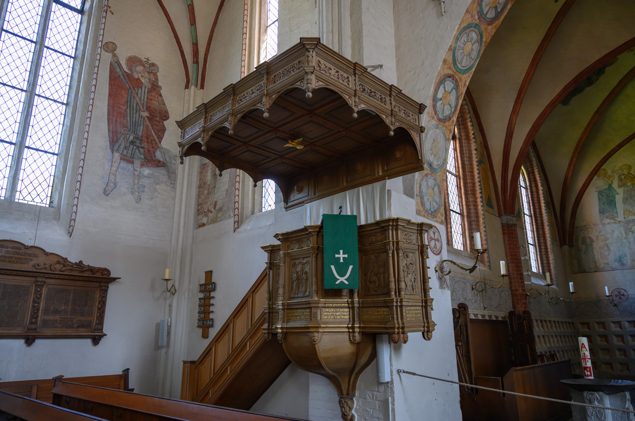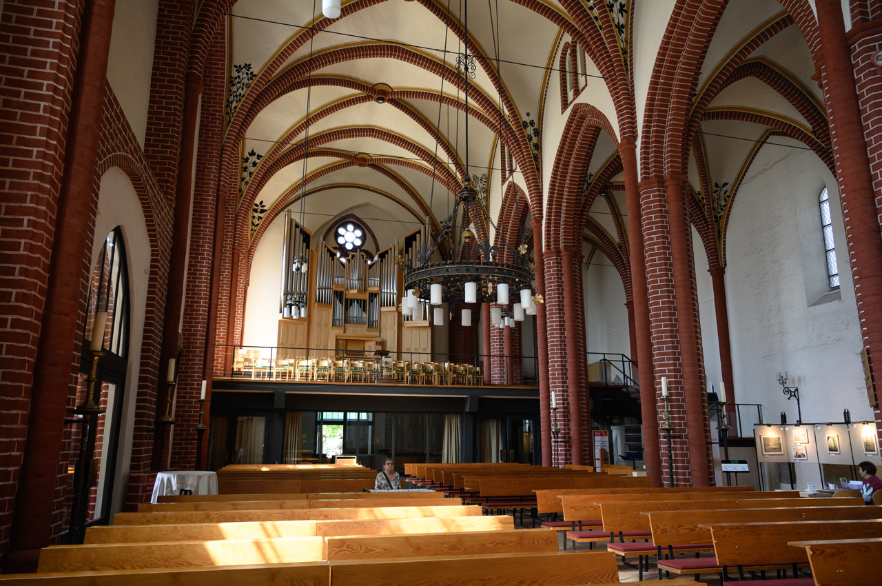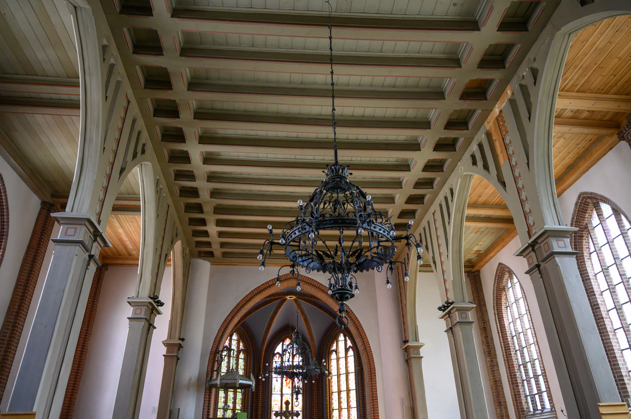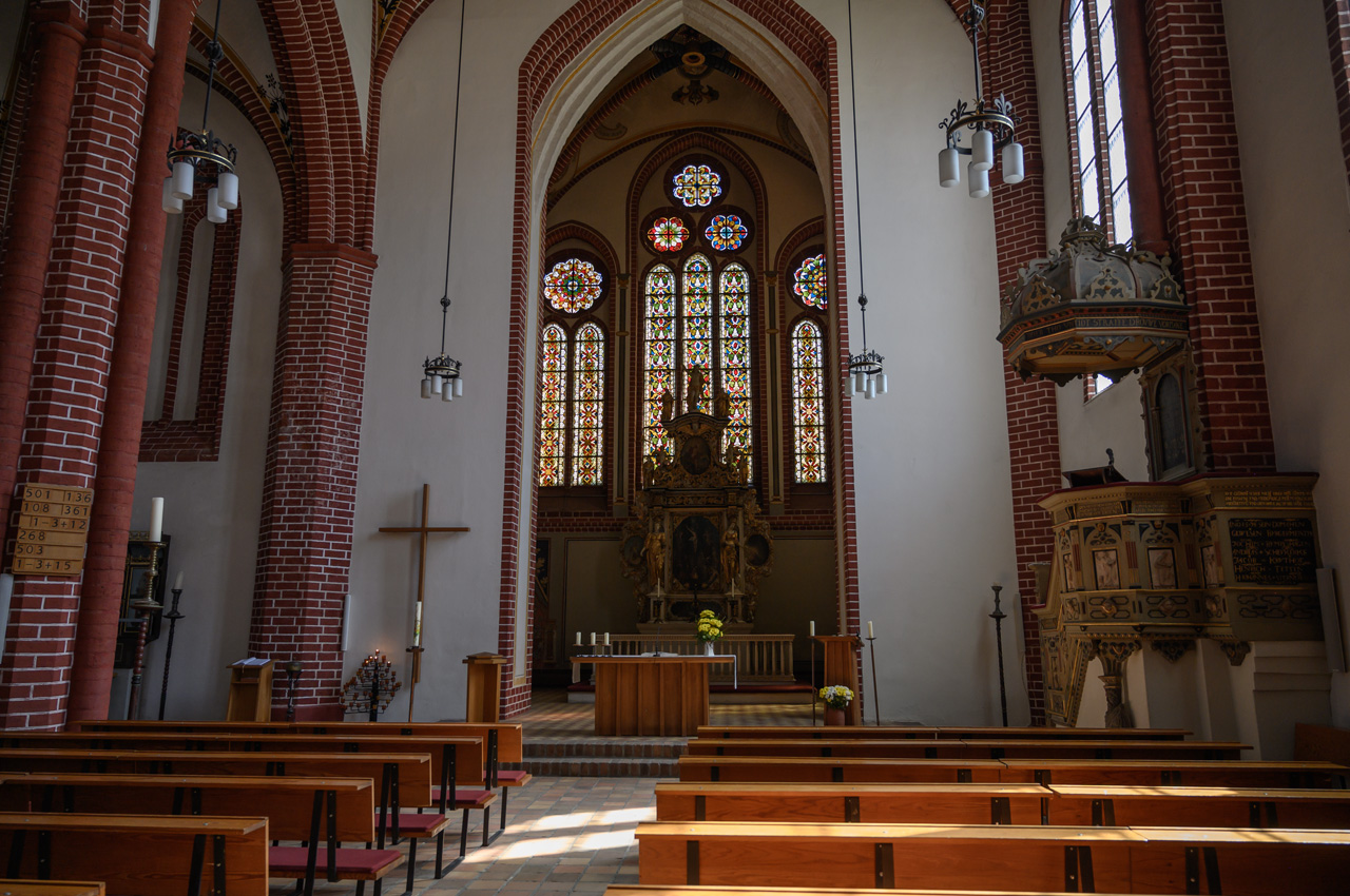 Auf dem Rückweg zum Womo haben wir noch einen Zwischenstopp in Usedom Stadt eingelegt. Hier war auch die Kirche offen. Am Vormittag fanden hier Konfirmationen statt. Die Kirche ist schlicht ausgestattet. Der Rest des Ortes stimmt ein eher depressiv. Außer uns kaum Menschen und kein offenes Café und das am Marktplatz. So etwas ist nicht schön.