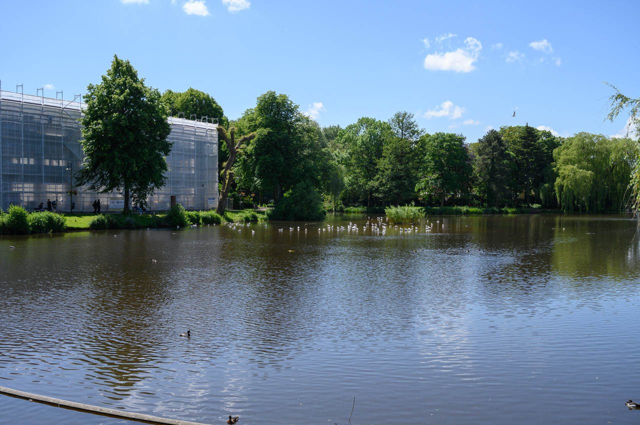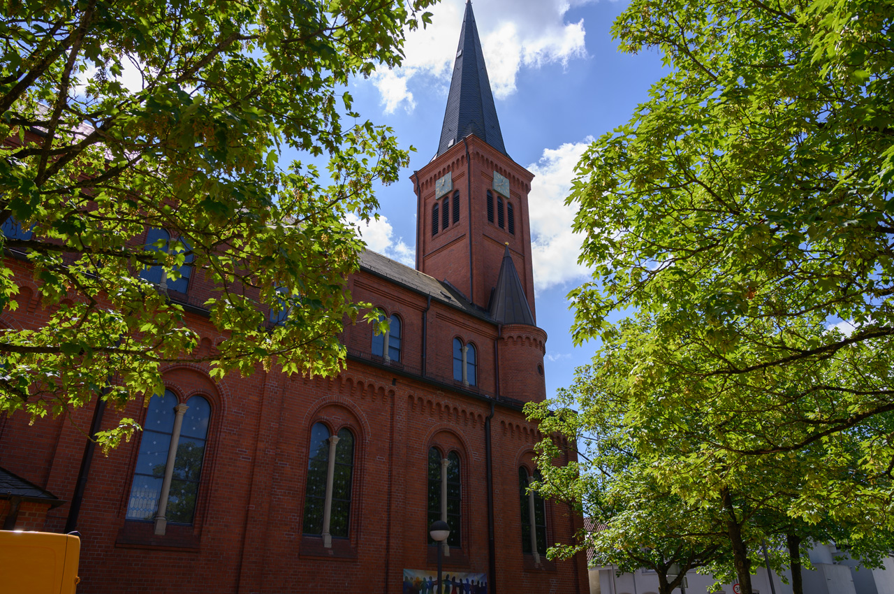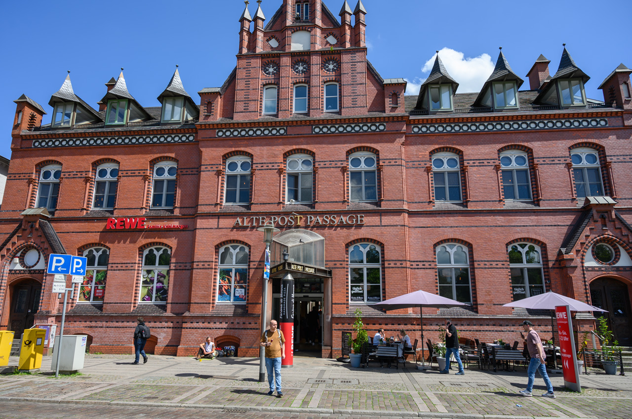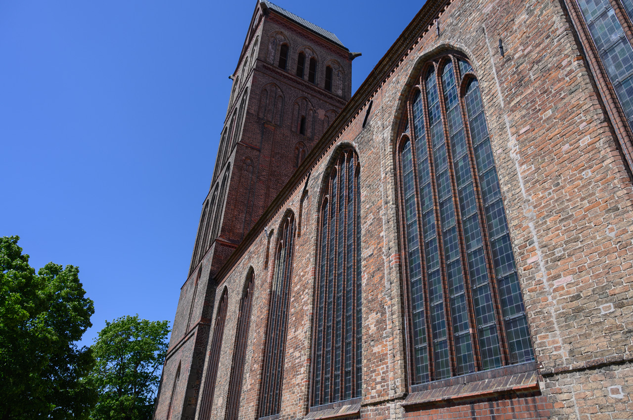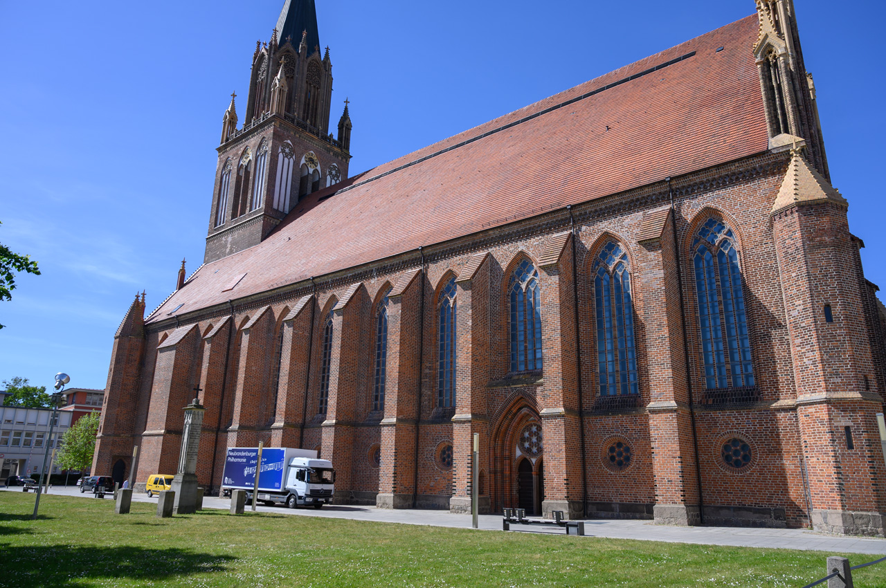 Gegen 12:00 Uhr sind wir dann gestartet. Der Himmel war bedeckt, aber es waren schon wieder 22°C. Es wehte allerdings ein bisschen Wind und dadurch hat man das gar nicht so warm empfunden. Wir sind vom Stellplatz aus direkt zum Nordufer vom Pfaffenteich gelaufen. Erstes interessantes Gebäude ist dort das historische Elektrizitätswerk, was heute das Mecklenburgische Staatstheater beheimatet. Ein sehr interessantes Gebäude. Wenn man bedenkt, dass es mal nur für ein Elektrizitätswerk gebaut wurde. Unmittelbar hinter dem E-Werk betritt man den Schweinemarkt und befindet sich damit in der sogenannten Schelfstadt. Sie wurde bereits am Beginn des Mittelalters als Neustadt bezeichnet und ist geschichtlich damit der jüngste Bereich von Schwerin, aber verfügt heute über den höchsten Bestand an historischen Bürgerhäusern. Mit dem Beginn der DDR-Zeit war dieser Stadtteil dem Verfall preisgegeben. Eine Bürgerinitiative, Architekten, Denkmalpfleger, Fotografen und die Tatsache, dass Ende der 1980er Jahre selbst das Geld für Abbrucharbeiten fehlte, retteten die architektonisch wertvolle Schelfstadt und bewahrten sie vor einem großflächigen Abriss und der Errichtung von Plattenbauten, wie dies zum Beispiel um 1970 auf dem Großen Moor in der Altstadt geschah. Seit der Wende wurde die Schelfstadt grundlegend saniert und 1991 ein Sanierungsgebiet mit 340 Gebäuden und mehr als 1000 Wohnungen ausgewiesen. Wir haben uns heute an dem sehr guten Zustand und an dem romantischen Flair dieser alten Häuser erfreut. Ein Juwel der Schelfstadt ist die Schelfkirche oder auch St. Nikolai. Sie verfügt über ein Querschiff und beherbergt unter dem Chor die Grablege des Mecklenburg-Schweriner Herzoghauses. Bei unserer Anwesenheit gab es einen Gitarrenspieler, der im Chor der Kirche gesungen hat. Hörte sich gar nicht so schlecht an. Nach dem Kirchenbesuch ging es vorbei an dem Neustädtischen Palais zum Dom. Weithin sichtbar ist der Glockenturm. Er ist mit seinen 117,5 m der höchste Kirchturm Ostdeutschlands. Auch das Innere hat viele Besonderheiten zu bieten. Im Umlauf des Chores gibt es mehrere Grablegen. Das Langschiff hat eine Innenhöhe von 26,5 Meter und ist 105 Meter lang. Man kommt sich darin schon etwas verloren vor. Unser Aufenthalt im Dom wurde durch das Klingeln unserer Handys dominiert. Sicherheit Nord wollte uns mitteilen, dass der nächtliche Sicherheitsanruf seit mehreren Tagen ausfällt. Weil sie uns nicht gleich erreicht haben, wurde dann noch Jörg angerufen, der dann wiederum Susanne anrufen wollte. Peinlich, weil der Klingelton durch den ganzen Dom dringt. Wir sind dann hinausgegangen, um das Problem zu klären. Weiter ging es dann zum Markt. Dort dominiert das sogenannte Säulengebäude, eine ehemalige Markthalle. Vom Markt sind wir zurück zum Pfaffenteich. Dieses Mal an das Südufer mit der Fontäne. Auf dem Weg dorthin haben wir uns mit Brötchen und Kuchen versorgt. In einem Fleischerladen haben wir Mett für heute Abend besorgt. Laut Susanne war das, das billigste Mett seit langem. Für über 300 g haben wir unter 3,-€ gezahlt. Bevor wir über den Bahnhofsplatz zurück zum Womo gegangen sind, war ich noch in der Paulskirche. Die war eigentlich nicht geöffnet, da aber gerade jemand sauber gemacht hat, hat er mich eingelassen. Die Kirche hat nichts Aufregendes, außer der komplett aus Holz bestehenden seitlichen Emporen. Susanne hat sich diese Kirche erspart. Der Zugang war mit Treppen verbunden, da die Kirche auf einer kleinen Anhöhe liegt. Im Womo angekommen, war es Zeit für unseren Nachmittagskaffee, der gleichzeitig auch der letzte im Womo auf dieser Tour war.