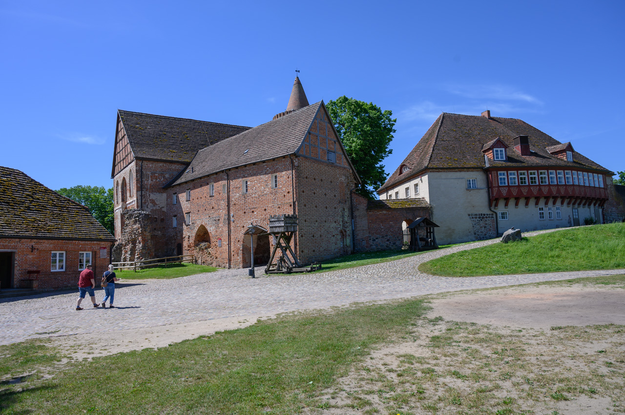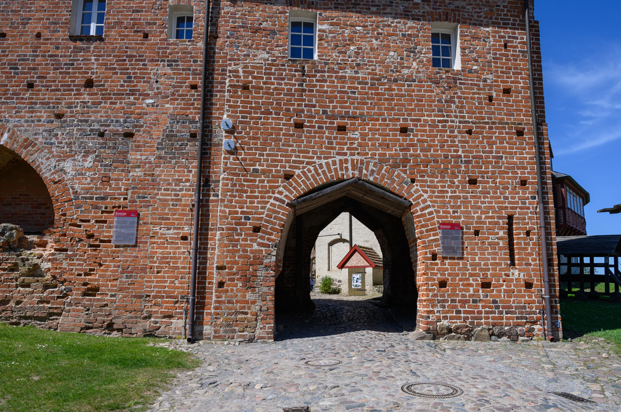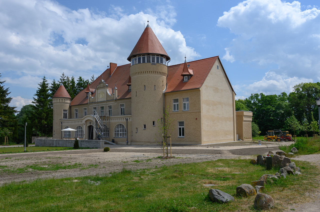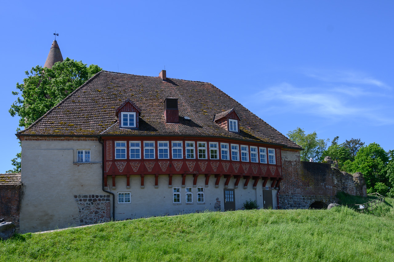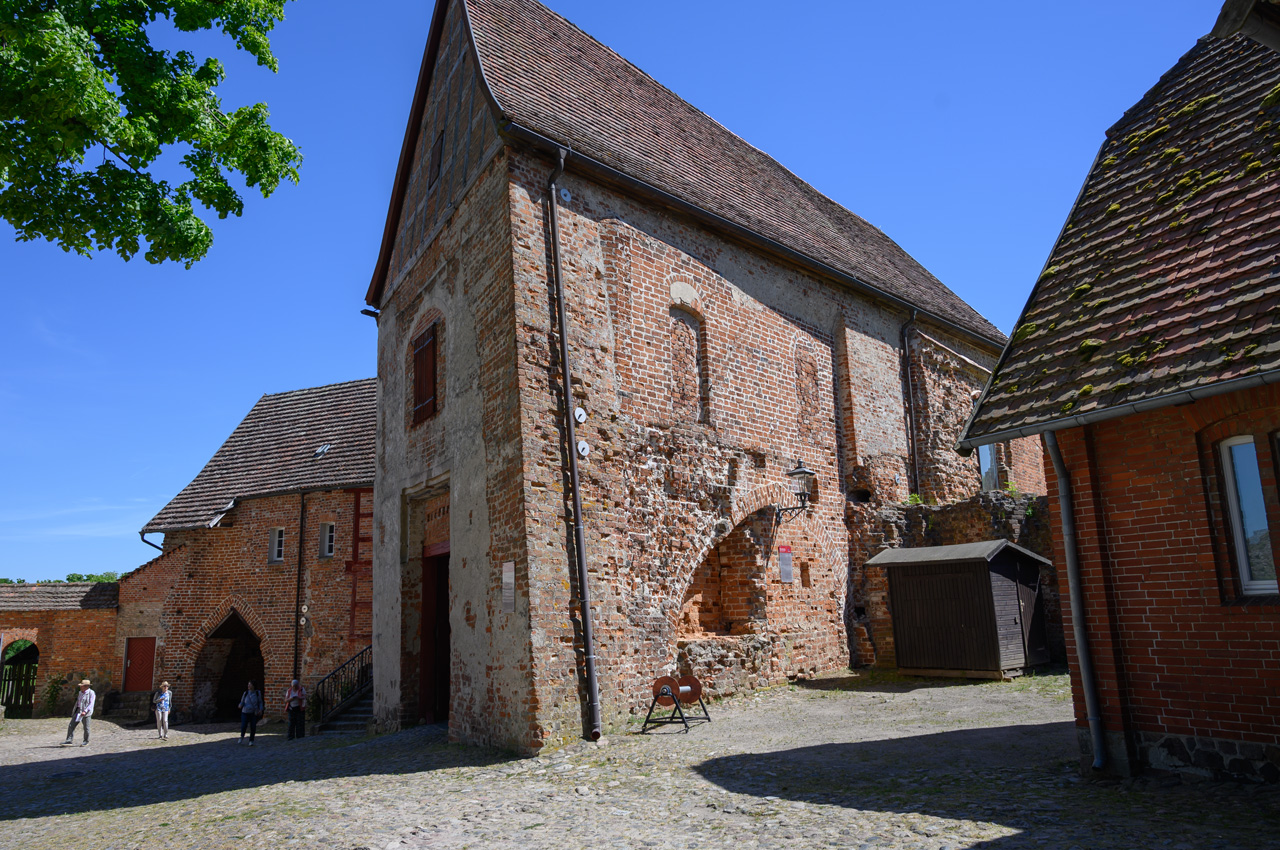 Zeitnah nach einem Kaffee habe ich den NIU startklar gemacht. Der Wetterbericht hat für heute Nachmittag hohe Regenwahrscheinlichkeit angezeigt. Unser erstes Ziel sollte das Schloss Stolpe sein. Allerdings hat uns unser Navi über Usedom Stadt geführt, was ich eigentlich nicht wollte. Wir wollten uns Usedom Stadt erst auf dem Rückweg ansehen. Das Schloss in Stolpe kann man ohne Eintritt auf eigene Faust besichtigen. Die DDR hat diesem Bauwerk böse mitgespielt. Bis zum Ende des 2. Weltkrieges bewohnte es die letzte Eigentümerin Freda Gräfin von Schwerin mit ihrer Familie. Sie wurde von den Russen kurze Hand enteignet und aus dem Schloss wurde eine Militärkommandatur. Danach hat die DDR es übernommen und dem Bau alles genommen, was ein Schloss so ausmacht aus purem Hass der Grafenfamilie gegenüber. Bis zur Wende wurde es für unterschiedliche Zwecke genutzt, aber eben nur benutzt und nicht instandgehalten. Nach der Wende war es dem Verfall preisgegeben. Erst 2001 begann ein Verein gemeinsam mit der Stadt dieses Schloss wieder herzustellen. Heute, mal abgesehen von einigen Restarbeiten, erstrahlt es wieder im altem Glanz. Es ist der Öffentlichkeit zugänglich und die Besichtigung kostet keinen Eintritt. Eine schöne Sache, dass es Menschen gibt, die sich um den Erhalt solcher historisch wertvollen Güter kümmern.