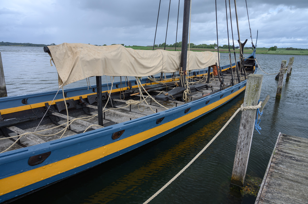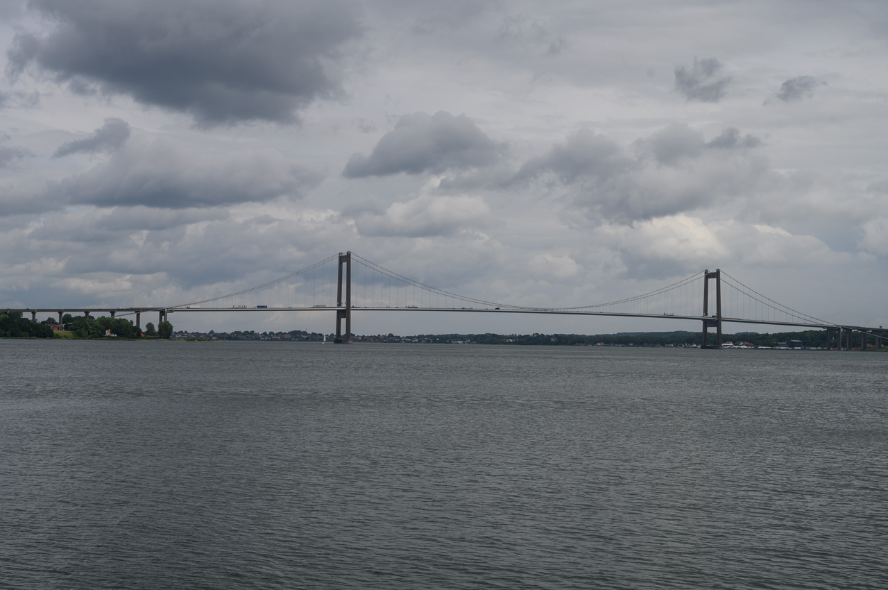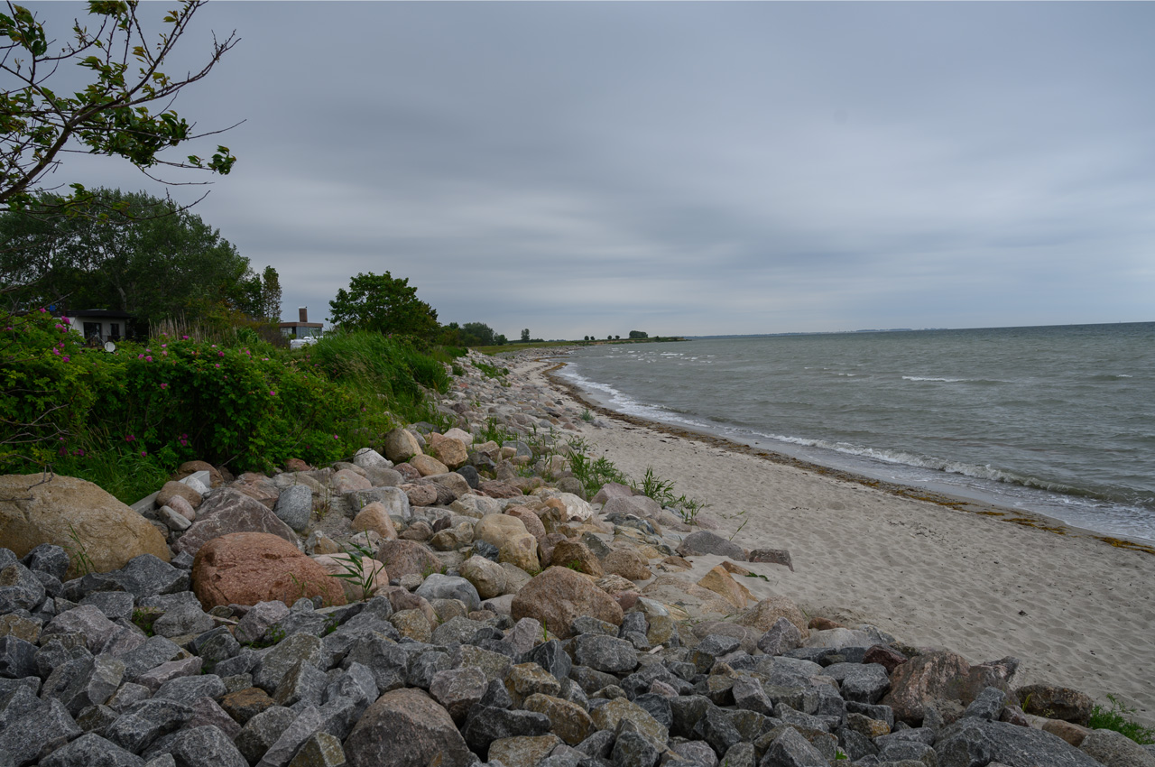 Kurze Zeit nach dem Nachmittagskaffee gab es wieder erste Lücken in der Wolkendecke. Ich habe mich nochmal alleine auf den NIU gesetzt und bin zu der Brücke über den Ulvsund gefahren. Hier habe ich die Drohne aufsteigen lassen und die Brücke von allen Seiten gefilmt. Dabei gab die Drohne fast non Stopp Warnsignale, das der Wind zu böig ist für eine sichere Landung. Bei so einem Wetter habe ich mir sowieso angewöhnt, die letzten Meter der Landung nicht der Automatik zu überlassen. Das hat auch gut funktioniert. Ich habe die Drohne wieder sicher zum Ausgangspunkt zurückgebracht. Von der Brücke aus bin ich weiter in Richtung zu dem kleinen Ort Borren gefahren. Etwas südlich von diesem Ort liegt das Wikingergrab Kong Asgers Høj. Dieses Hügelgrab wurde 1838 von einem Hobbyarchäologe erkundet. Er fand jedoch nur wenige Feuersteinflecken, eine 600 Jahre jüngere Streitaxt und abgebrochene Skelettteile, die nicht näher bestimmt werden konnten. Die Funde wurden dem Nationalmuseum übergeben. 1861 wurde das Haus des Riesen unter Denkmalschutz gestellt. Ein 11 Meter langer Gang führt in die 10m lange und 2m breite Grabkammer. Ich habe es mir verkniffen da hineinzugehen, da man den Gang in gebückter Haltung entlang laufen muss und der Boden durch den Regen der letzten Tage matschig ist. Die Drohne wollte auch nicht hineinfliegen. Sie maulte und meinte der Sicherheitsabstand sei zu gering. Da ich hier allein war, habe ich die Gelegenheit genutzt die Modi der automatischen Drohnenflüge auszuprobieren. Auf dem Rückweg von dort, konnte ich die schöne Landschaft dieser Insel genießen.