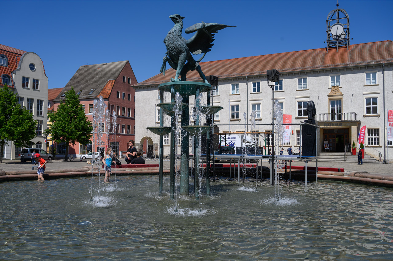 Nachdem wir uns mit dem Platz vertraut gemacht haben, gab es unseren Zwischenkaffee. Danach haben wir einen Spaziergang gemacht in die Altstadt. Auf dem Hinweg sind wir entlang der Peene bis zum Stadthafen gelaufen und dann in Richtung Marktplatz. Auch dieser Marktplatz ist riesig und relativ leer. Allerdings gibt es im Zentrum des Platzes einen Springbrunnen. Im Rathaus ist auch die Touristeninfo. Einen Stadtplan hatten wir aber schon vom Stellplatz erhalten. In dem kleinen Einkaufscenter überfiel uns eine etwas düstere Stimmung. Mehr als die Hälfte der Ladenflächen stehen leer. Das Geschäftesterben ist hier schon ziemlich heftig. In dem Woolworth haben wir eine neue Tischdecke gekauft. Sie ist aus Papier und wir können sie uns für den Tisch in der Sitzecke zurechtschneiden. Eine neue Klobürste und Sandaletten für jeden von uns haben wir auch noch gekauft. Von da aus ging es dann zurück zum Womo. Einen Bäcker gibt es offensichtlich nur am Marktplatz. Der ist aber auch fußläufig machbar.