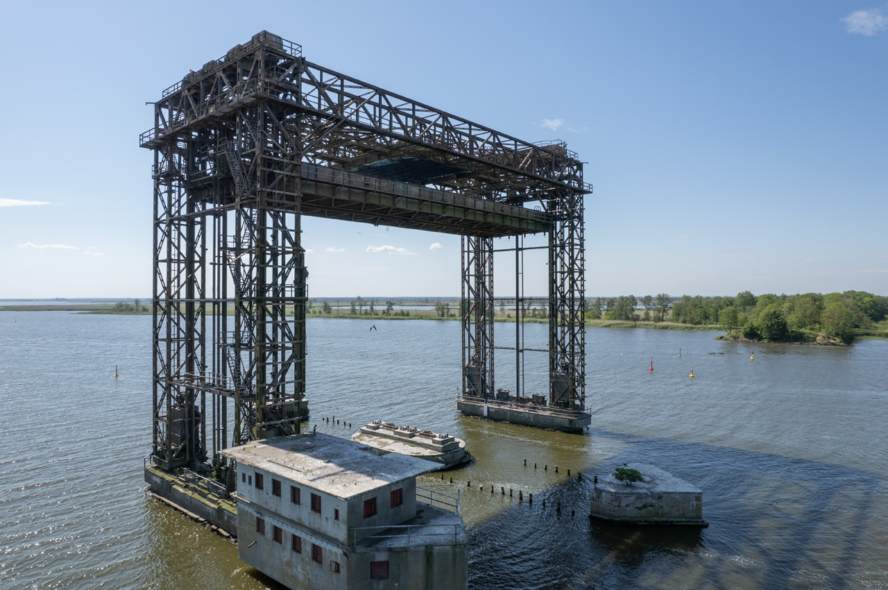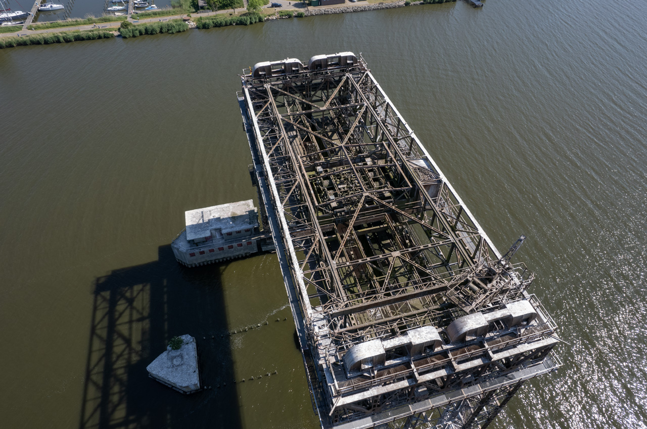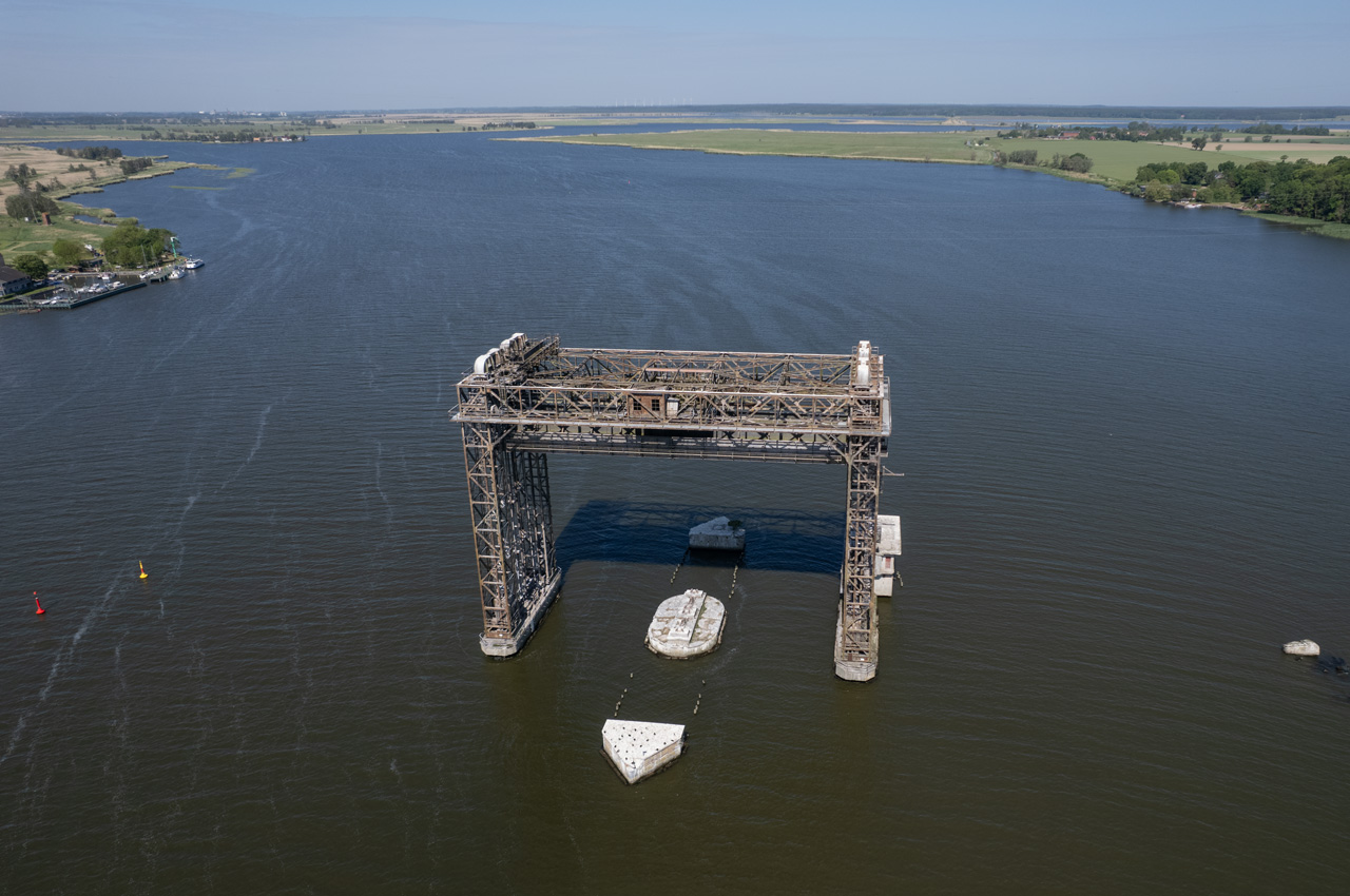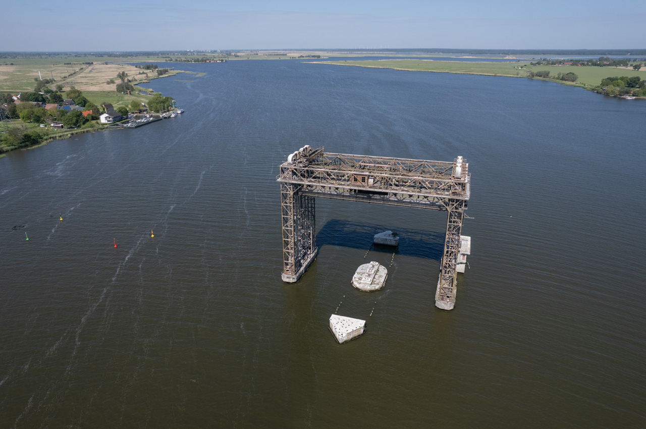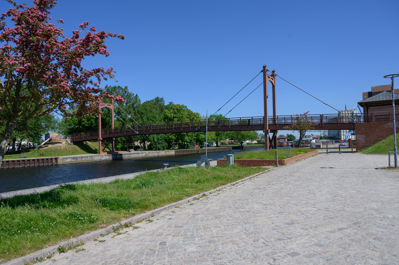 Da der Wetterbericht ab Mittag die Regenwahrscheinlichkeit heraufgesetzt anzeigte, haben wir uns zeitnah auf den NIU gesetzt und sind in Richtung Anklamer Fähre gefahren. Schon nah hinter Anklam endete die Asphaltstraße in eine Kopfsteinpflasterstraße. Die war so miserable, dass es unseren NIU und damit auch Susanne kräftig durchgerüttelt hat. Ich bin weitestgehend auf dem sandigen Seitenstreifen gefahren, mit sehr niedriger Geschwindigkeit. Kurz vor Gnevezin war die Straße dann wieder asphaltiert. Hinter Gnevezin gab es eine komplett neue Straße, die auch in Google nicht verzeichnet ist. Die tolle Asphaltstraße führte direkt nach Kamp. Von hier aus wollte ich den Rest der Hubbrücke bei Karnin mit der Drohne aufnehmen. Das Wetter war perfekt und der Ausgangspunkt auch. Nach unserem Plan stehen wir zwar dann morgen genau auf der anderen Seite des Peenestroms wo eigentlich der Drohneneinsatz geplant war, aber da können wir die Zeit anders nutzen.