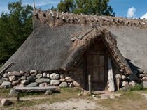 In der Gegend gibt es klare Überreste eines Dorfes aus der Zeit der Migration. Besonders interessant ist, dass dies ein großer Männerhof ist, in dem einige Ausgrabungen vorgenommen wurden. Der Hof besteht aus vier Häusern. Was an diesem Ort sehr interessant ist, ist, dass es einen Gastbankettsaal gibt, in dem sich Reste eines Feuers befinden, das einst das Haus zerstört hat. Dies hat dazu geführt, dass einige Dinge wie Holz und auch Stoffreste besser erhalten geblieben sind als im unverbrannten Zustand. Neben dem Gastbankettsaal gibt es ein Wohnhaus, ein Schuppenhaus und ein Haus, das sowohl in Wohnhäuser als auch in Schuppenhäuser unterteilt wurde. An einem Ort, nur wenige hundert Meter von den alten Überresten entfernt, bauen wir gerade den Hof des Sturmmenschen mit den umgebenden Landschaften um, damit Sie ihn so sehen können, wie er einst ausgesehen hat. In Betracht zu ziehen ist derzeit ein Wohnhaus und ein ausgebranntes Haus zusammen mit den umliegenden Feldern. Es gibt auch ein Opfermoos, das vor etwa 1500 Jahren von Einheimischen verwendet wurde.