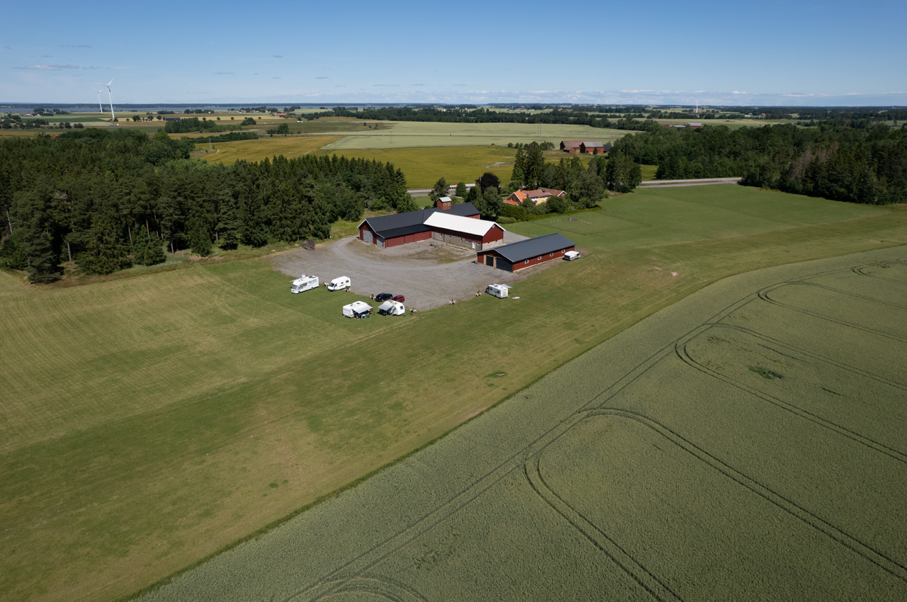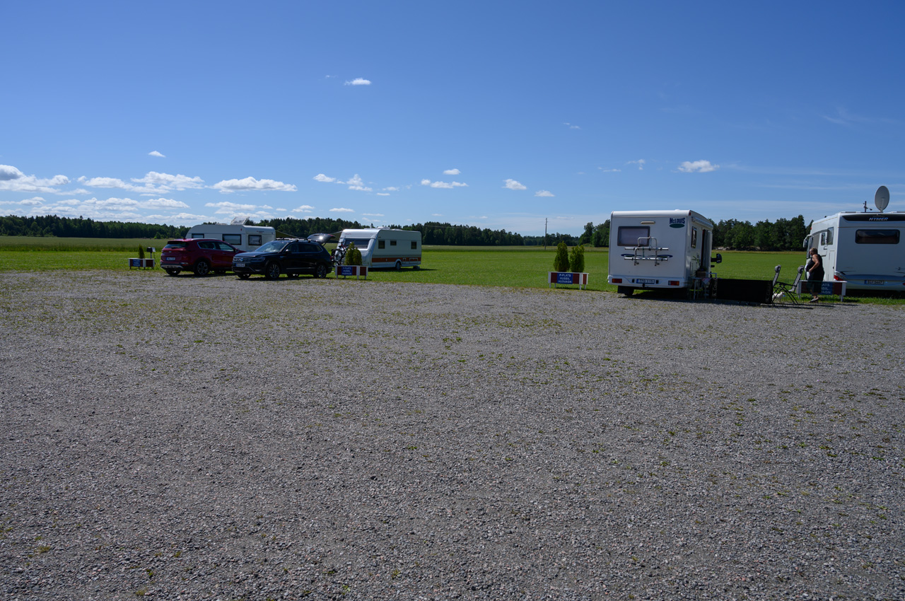 - Die Stellflächen befinden sich hinter den Wirtschaftsgebäuden eines ehemaligen Bauernhofes. Man steht auf Wiese oder Schotter. Die Stellflächen sind nicht markiert. Die Wiesenfläche ist extrem groß mit weiter Sicht in die Landschaft.