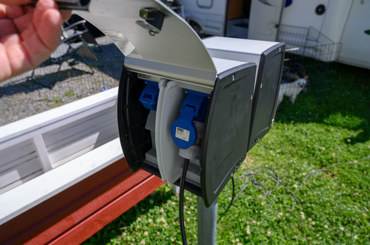 - Für Strom stehen zwei Säulen zur Verfügung mit den typisch schwedischen Anschlusskästen. Die Anschlüsse sind in CEE-Ausführung.