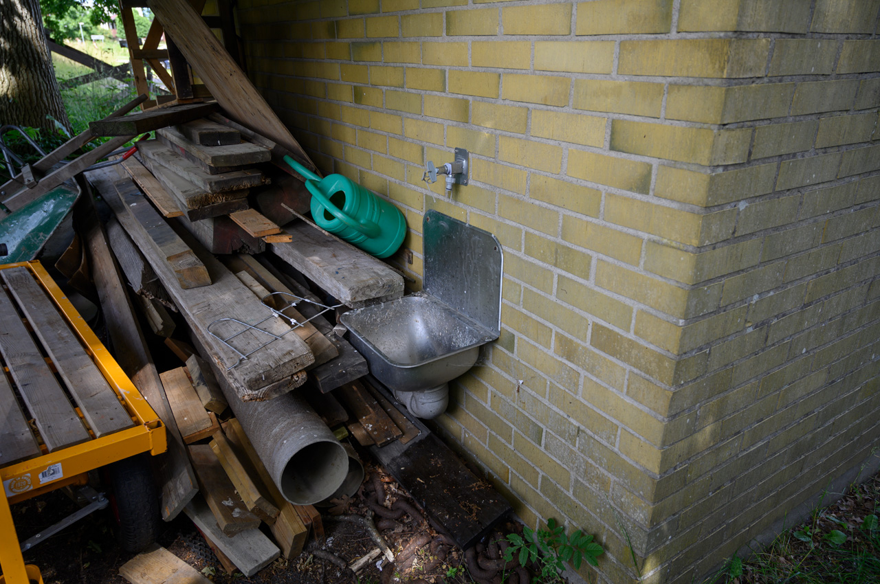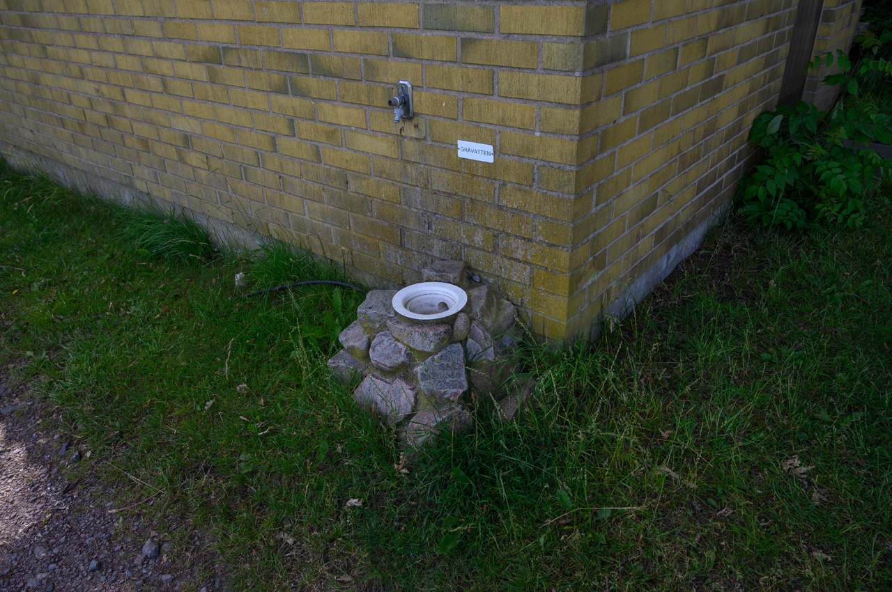 - Die V+E Einrichtung sind Marke Eigenbau. Die Toilettenentsorgung befindet sich hinter dem Sanitärhäuschen, in dem auch die Toiletten sind. Der Grauwassereinlass ist ca. 30 cm über dem Boden an der Vorderfront des Gebäudes.