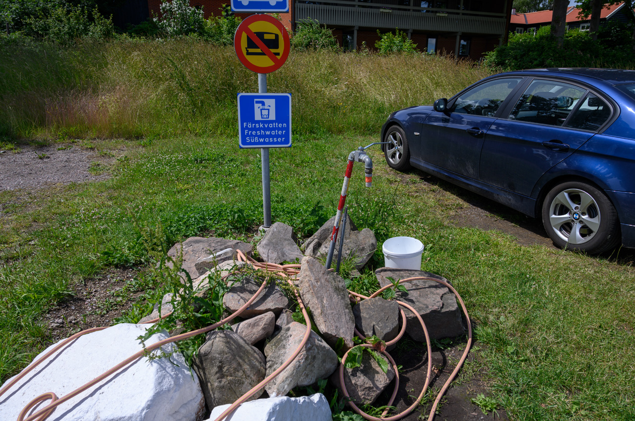 - Die Stellflächen befinden sich neben einem Hafen auf Wiesenschotter. Die Stellflächen sind nicht markiert. Man steht direkt an der Uferböschung aus massiven Felssteinen ca. 5 Meter über Meeresspiegel.