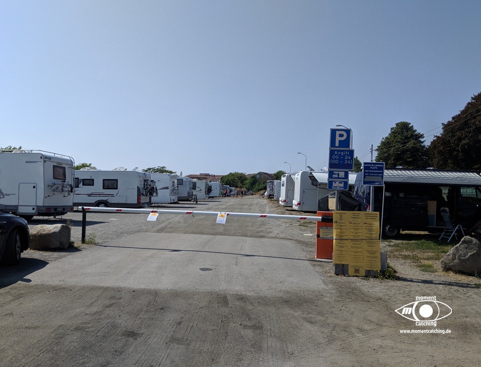 - Das Gelände befindet sich zwischen der Bahnstrecke und dem Badestrand am Yachthafen von Ystad. Die Zufahrt ist durch Schranken blockiert. Man muss sich einen freien Platz aussuchen und mit der dazugehörigen Nummer zum Hafenbüro gehen und dort unter Angabe der Nummer bezahlen. Man erhält dann eine Tally-Card mit der man die Schranken öffnen kann. Die Tally-Card ist aber auch für den Strombezug und den Zugang zu den Sanitärräumen.