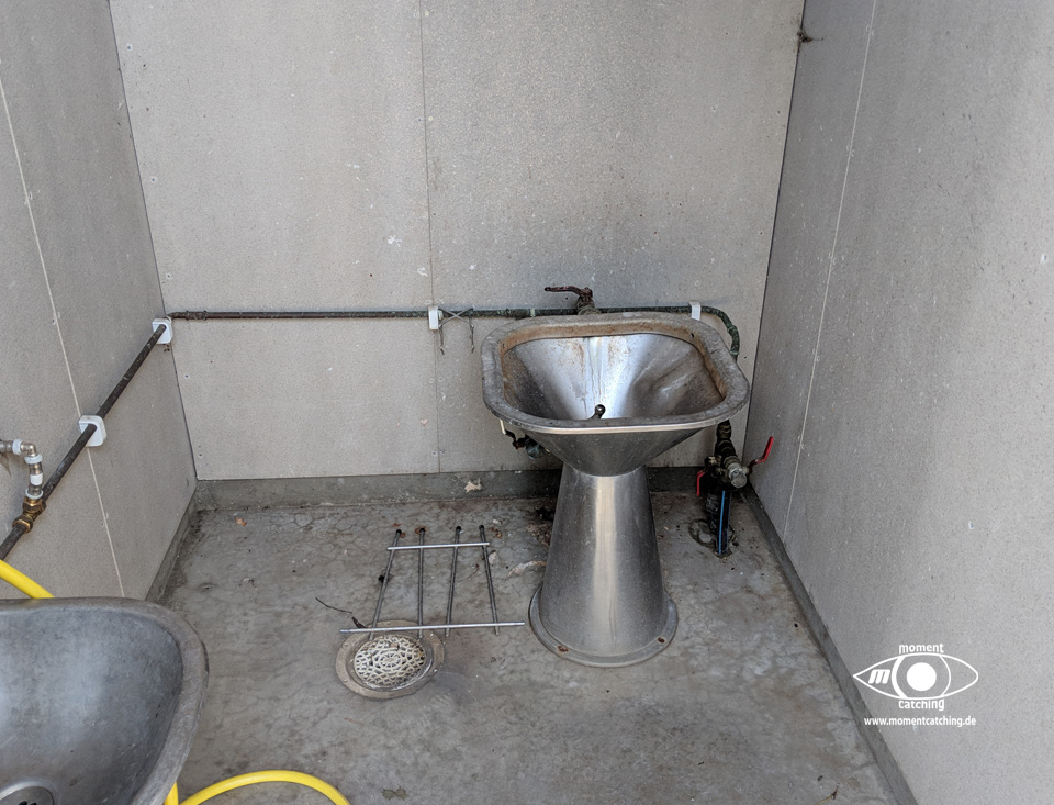 - Die sanitären Einrichtungen sind nicht besonders gut. Die Duschen sind frei in einem Raum. Sie machen einen ungepflegten Eindruck genauso wie die Fäkalienentsorgung. Grauwasser kann nur über Wanne entsorgt werden.